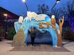 As the sun went down and the lights came alive, the campus transformed. Live penguins danced in the falling snow, trees shimmered with color, and families gathered throughout the grounds to explore the dazzling light displays. I decorated a cookie in Mrs. Claus’ kitchen and visited with Santa Claus in his village.