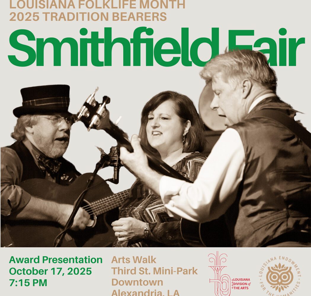 As Smithfield Fair’s newest album noted, the band will be honored in October as Louisiana Folklife Commission 2025 “Tradition Bearers.” At 7:15 p.m., Friday, October 17th, 2025, join them as part of the Fall ARTSWALK of the Arts Council of Central Louisiana on the mini-park stage on 3rd Street in Alexandria (between Johnson & Desoto).